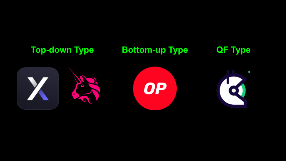 This survey quantitatively compares the grants programs offered by Uniswap, dYdX, Optimism, and Gitcoin. Particularly, the focus was on the methods of selection and attributes for the individuals who have been managing and making decisions in these four grants programs. For Uniswap and dYdX, the managers of the grants programs are composed of members who are arbitrarily selected and approved by token holders. Subsequently, the Uniswap Foundation was established, which now manages the grants program. The selection methods used by Uniswap and dYdX, where the grants programs are operated, are referred to as "top-down type". In Optimism, grants managers are selected by token holders, or meet certain objective criteria. This is called the "bottom-up type". As for Gitcoin, there are no specific managers who decide who received funding and how much; instead, the grants amount is determined by an algorithm known as QF, based on contributions from an unspecified number of donors. This is termed the "QF type (algorithmic type)”.